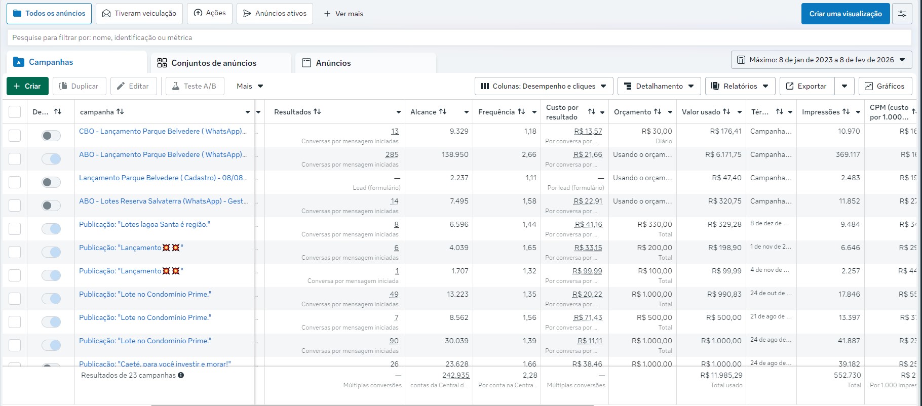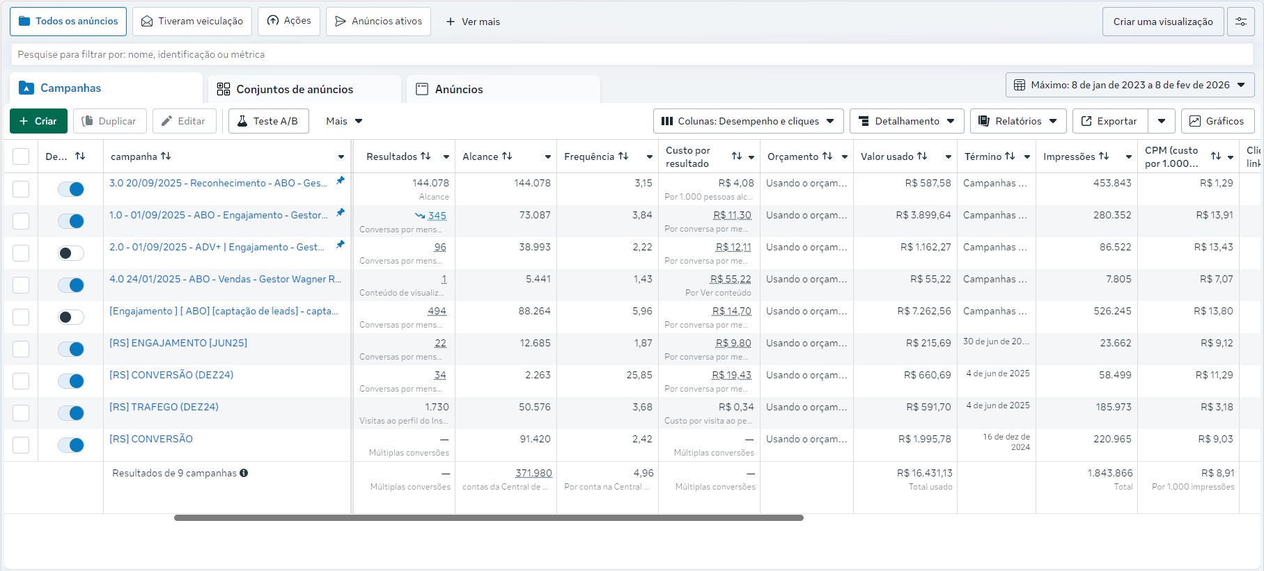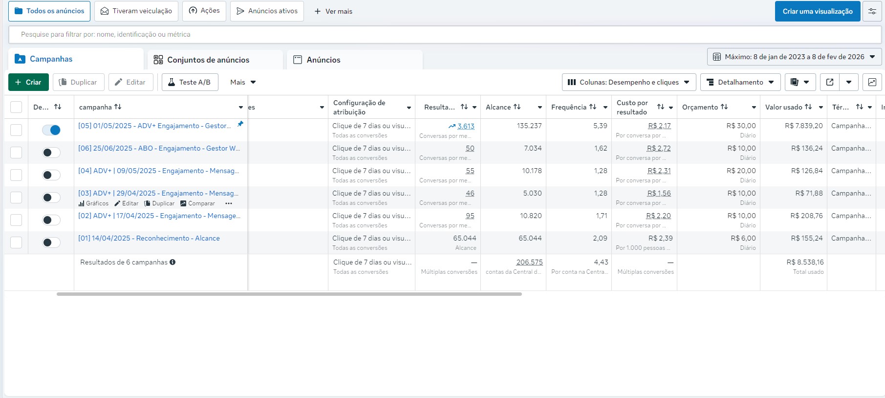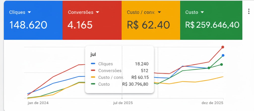Tudo é mensurável. São analisados indicadores como custo por lead, custo por mensagem, taxa de conversão, retorno sobre investimento e volume de oportunidades.